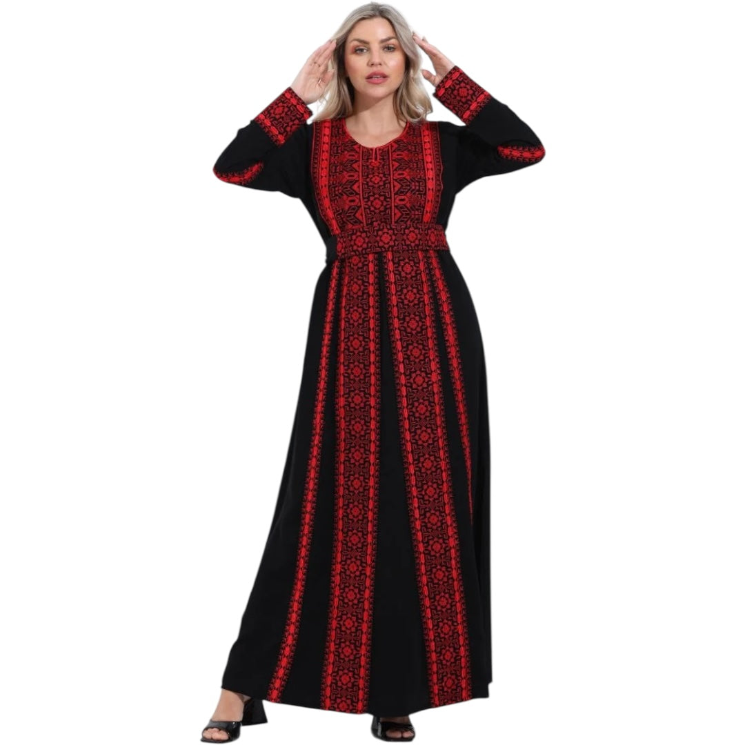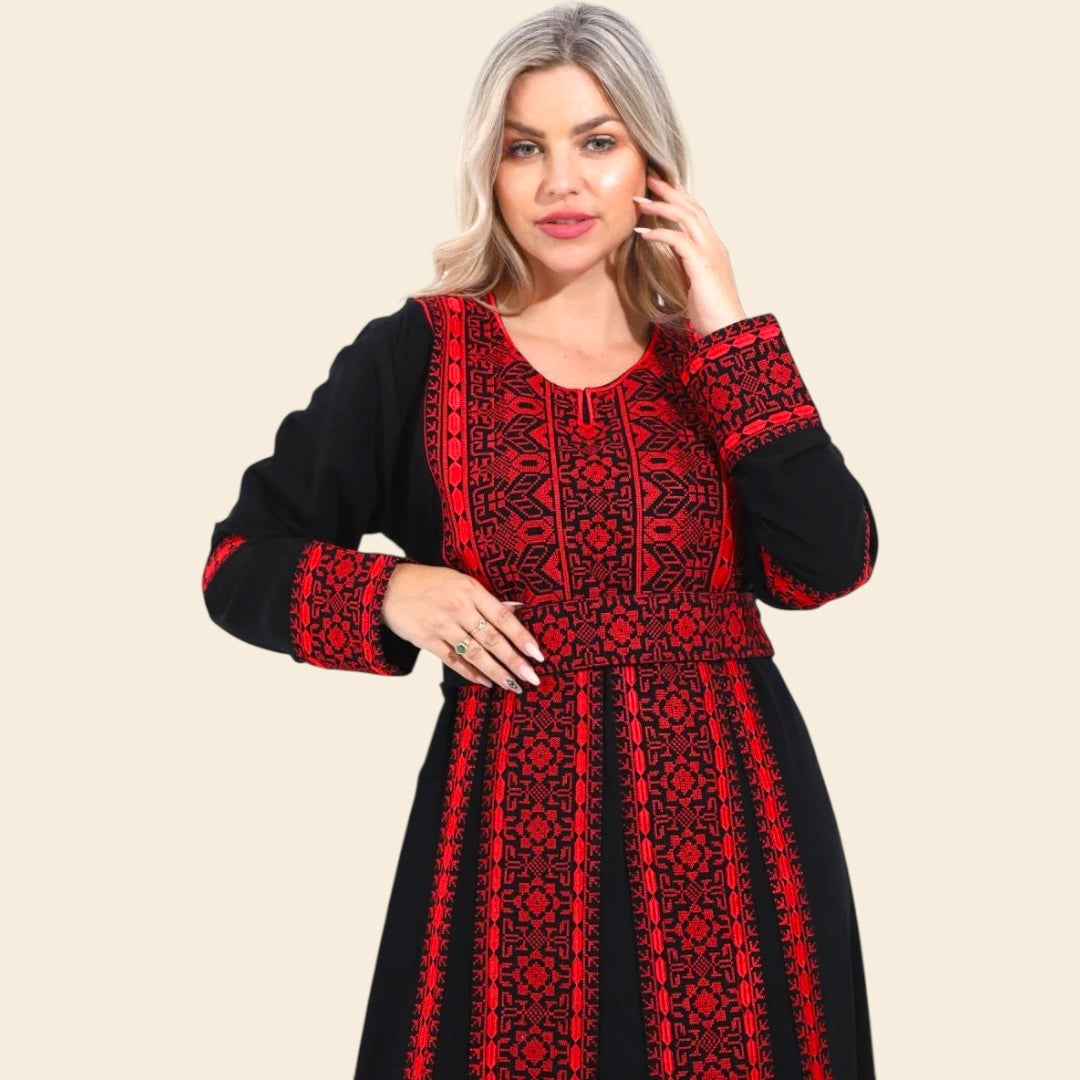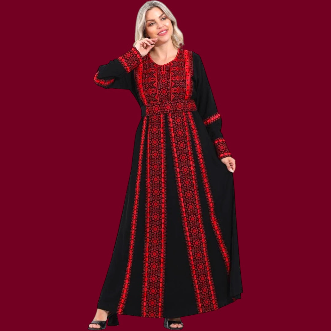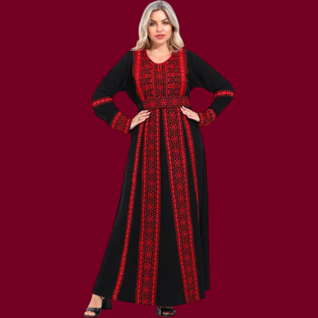 Wrap yourself in effortless style with our Hebron Thobe a flowing dress crafted from breathable cotton knit. Designed in a free, relaxed silhouette, it drapes beautifully for all-day comfort. This stunning piece is machine-stitched to perfection, ensuring durability while maintaining the beauty of authentic Palestinian embroidery.