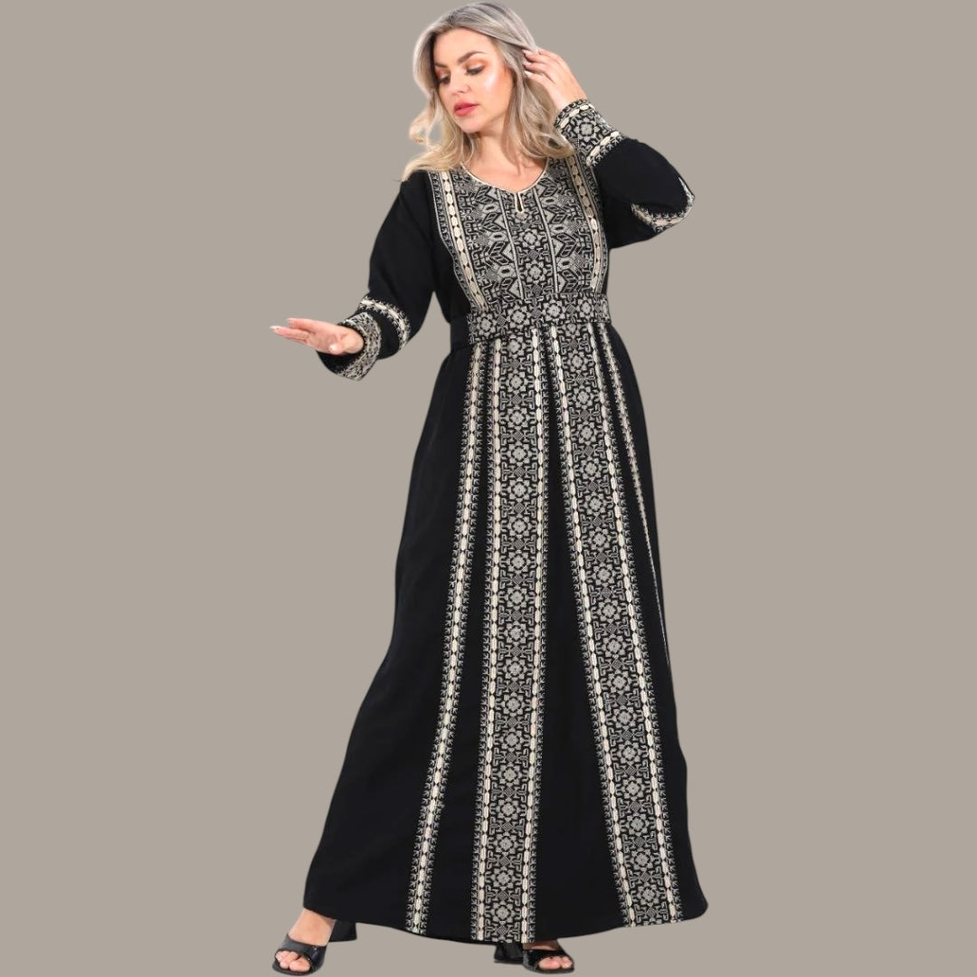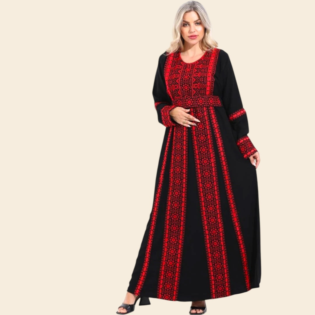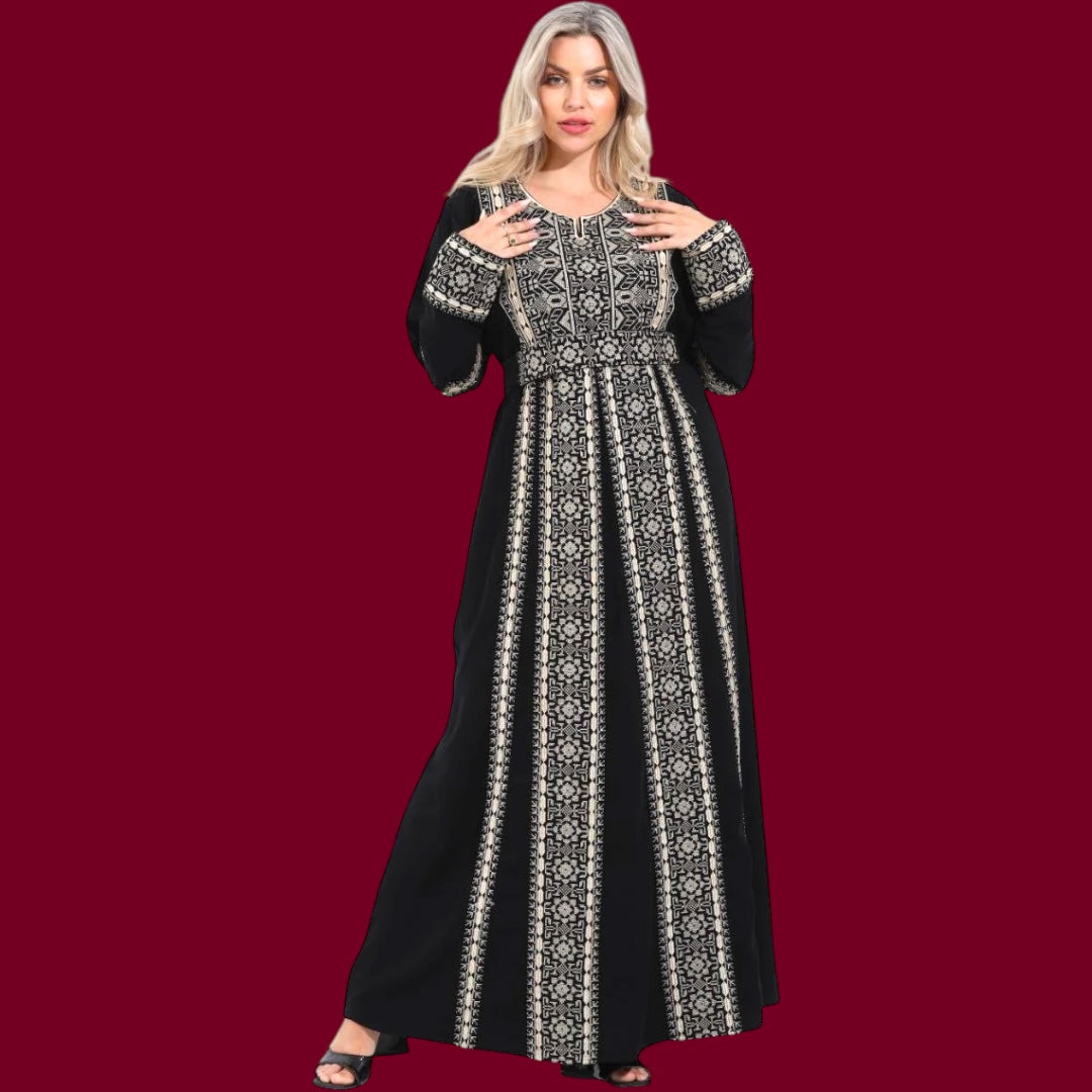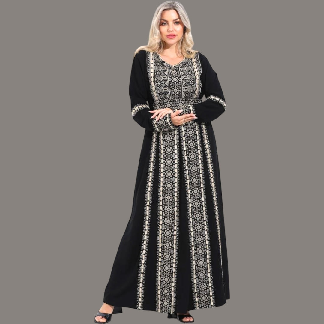 Wrap yourself in effortless style with our Hebron Thobe a flowing dress crafted from breathable cotton knit. Designed in a free, relaxed silhouette, it drapes beautifully for all-day comfort. This stunning piece is machine-stitched to perfection, ensuring durability while maintaining the beauty of authentic Palestinian embroidery.