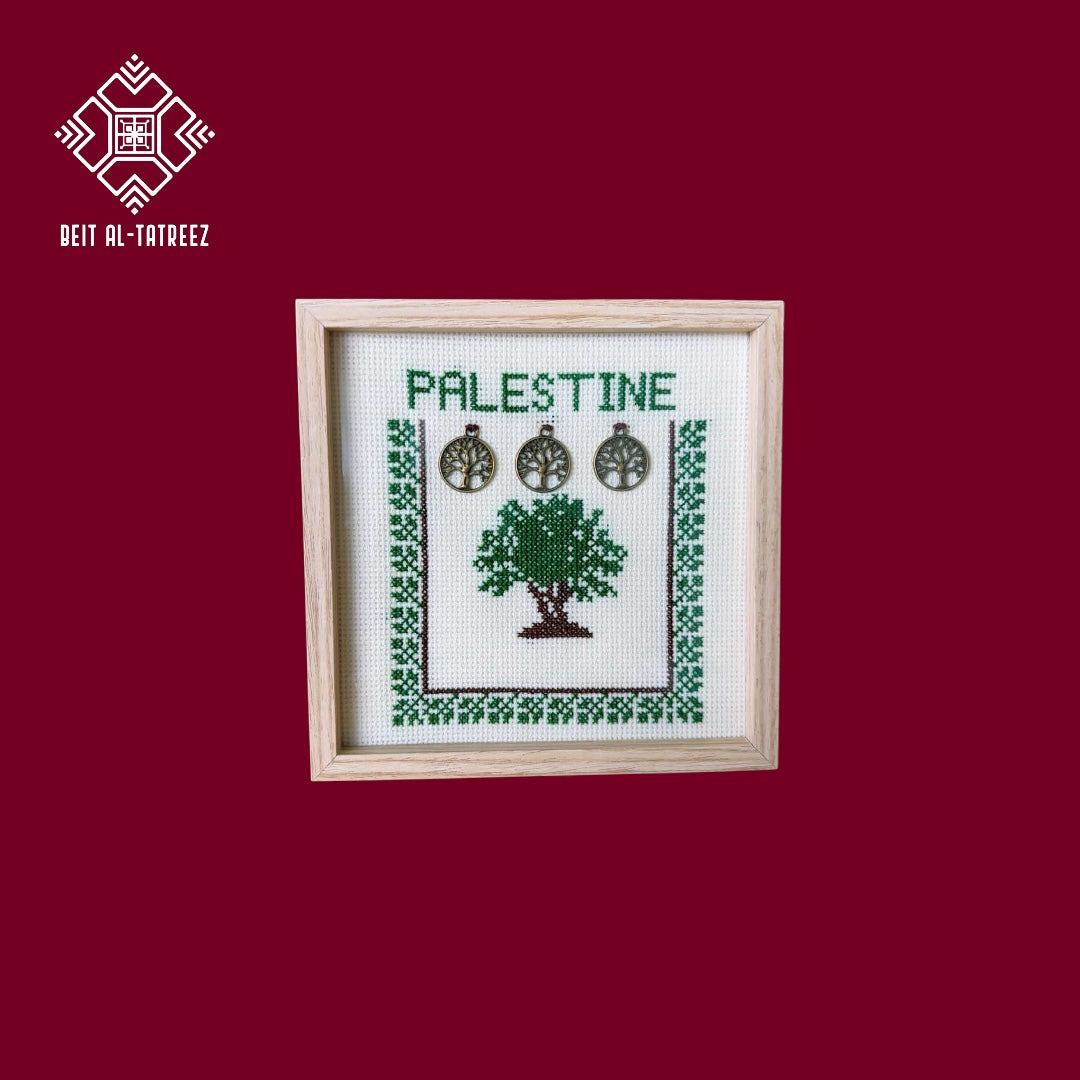 A symbolic framed piece featuring a hand-stitched olive tree surrounded by traditional patterns and “Palestine” text. Embellished with metal olive charms. No stand included.