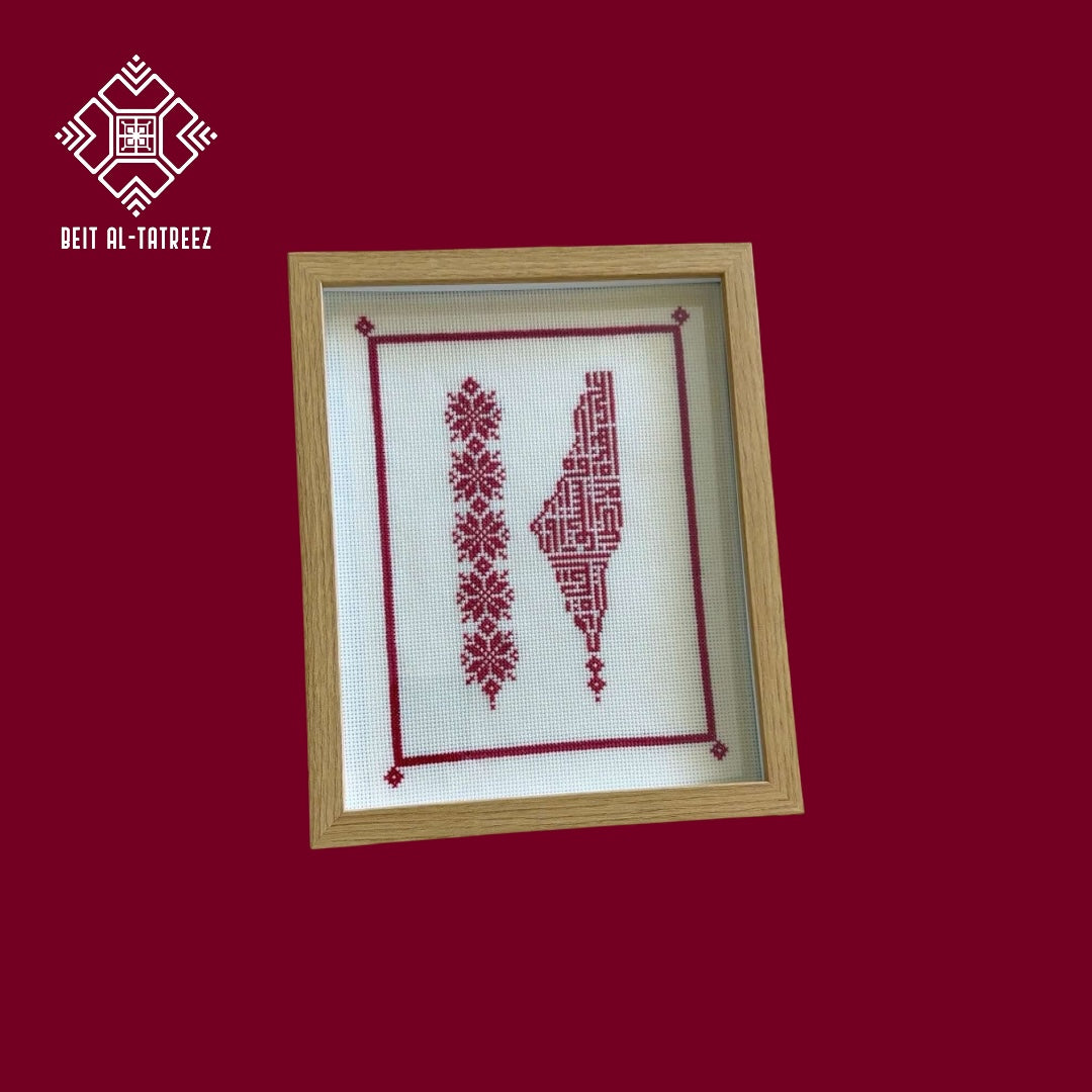 This framed embroidery features two designs: the map of Palestine and a tatreez panel. A unique dual tribute to Palestinian heritage. Includes a back stand.