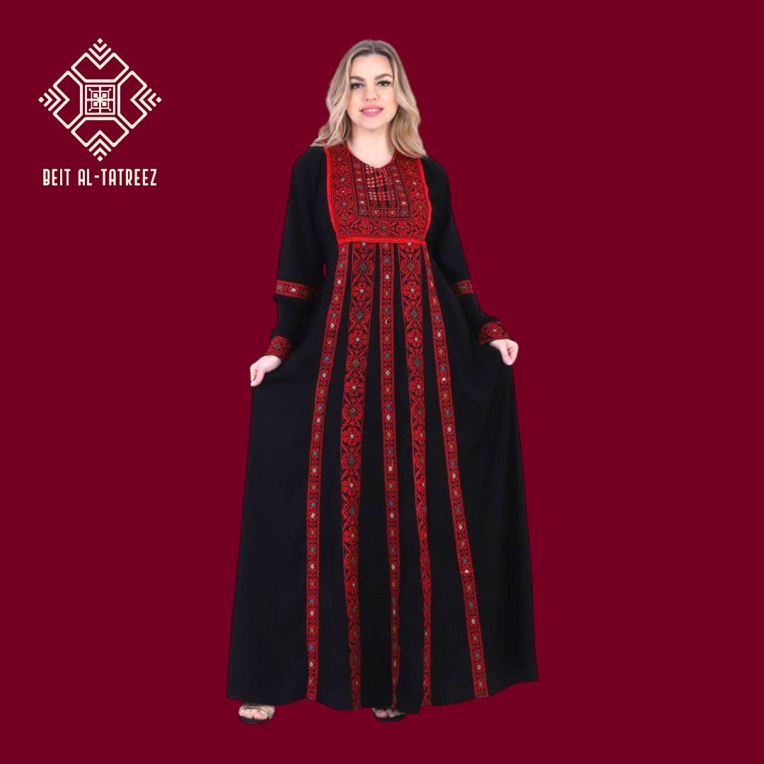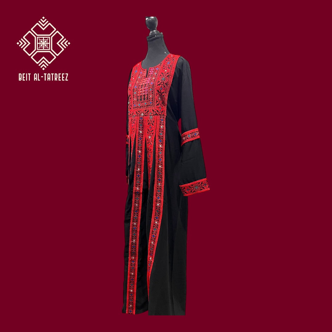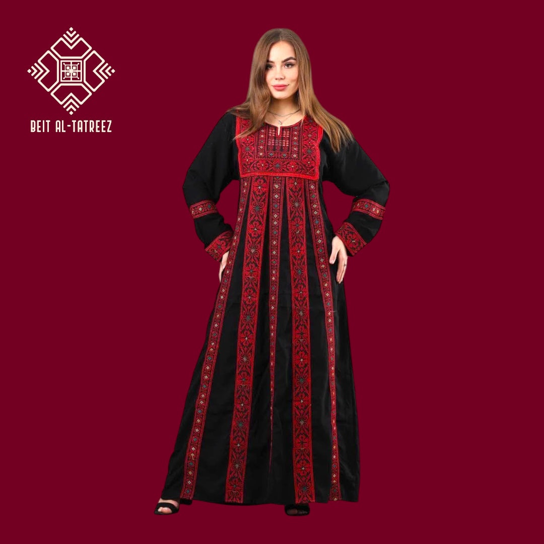 Step into tradition with the Traditional Red Embroidered Thobe, a perfect blend of cultural heritage and modern craftsmanship. This striking black thobe features intricate Palestinian tatreez (embroidery) patterns, machine-stitched with precision to honor the timeless artistry of our ancestors.